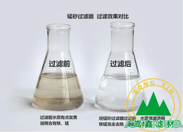天然錳砂濾料是一種良好的天然氧化劑,它能有效的將水中二氧化錳能氧化水中二價鐵為三價鐵使其沉淀除去,二氧化錳被水中的溶解氧氧化成七價錳的氧化物。用于地下水除鐵和除錳的天然錳砂濾料,其錳的形態(tài)應(yīng)以氧化錳為主。含錳量(以MnO2計,下同)不應(yīng)小于35%的天然錳砂濾料,既可用于地下水除鐵,又可用于地下水除錳;含錳量為20%~30%的天然錳砂濾料,只宜用于地下水除鐵;含錳量小于20%的錳礦砂則不宜采用。宜優(yōu)先采用經(jīng)過科學(xué)試驗或生產(chǎn)使用證明能獲得良好除鐵和除錳效果的天然錳砂品種作濾料。